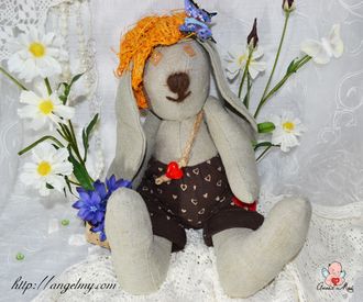 Оригинальный Заяц Садовник наполнен любовью и теплотой, он в ожидании заботливых и нежных рук. Заяц выполнен из натурального самотканого льна, его шапочка связана из кокосового волокна, очаровательные штанишки в сердечко сшиты из 100% мягкого хлопка. Работа сопровождается паспотом и подарочной упаковкой. Зайка уютный подарок для дачного интерьера на новоселье, день рождение, 8 марта. Размер: 30 см; Материалы: 100% лен, 100% хлопок, кокосовое волокно.